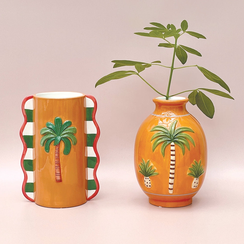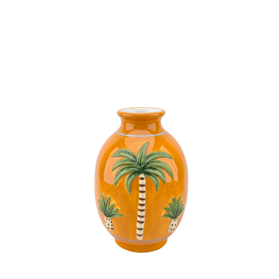 Orangene, runde Keramikvase mit tropischem Palmen-Relief