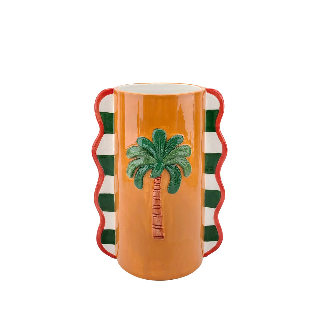 Zylindrische Keramikvase mit Palmen-Relief und Wellenrand