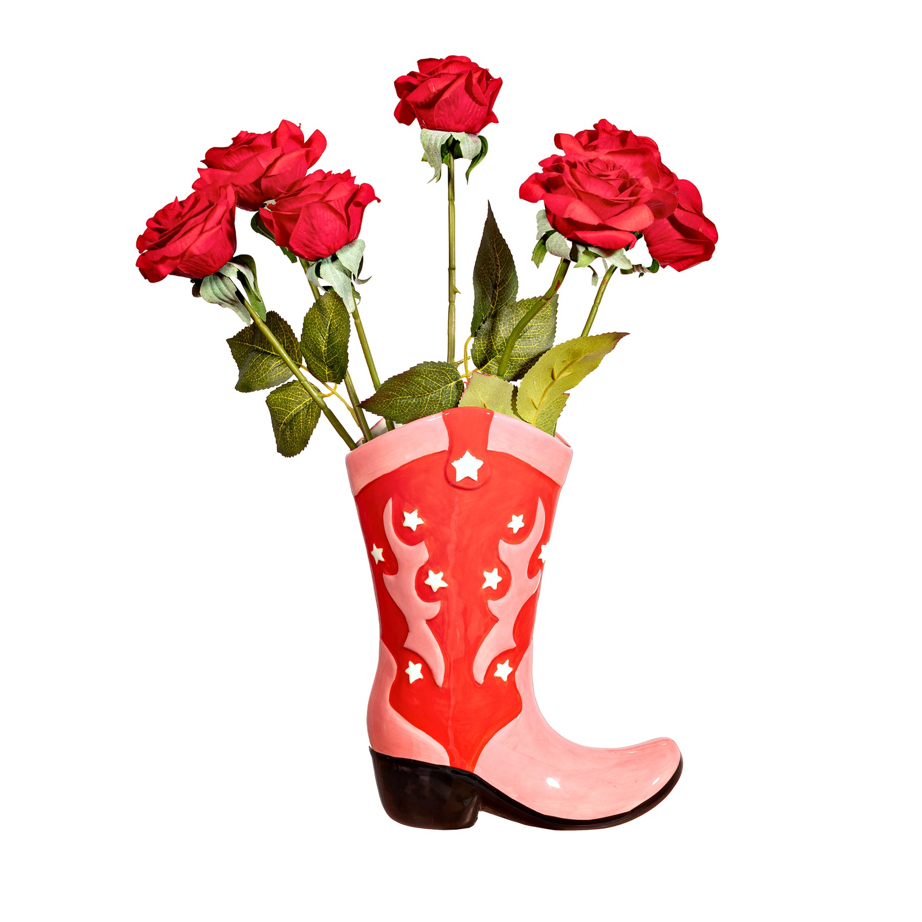 Bringe einen Hauch des Wilden Westens in deine Wohnkultur mit dieser lebhaften Cowboy-Stiefel-Vase in Rot. Eine originelle und spaßige Art, deine Blumen zu präsentieren.