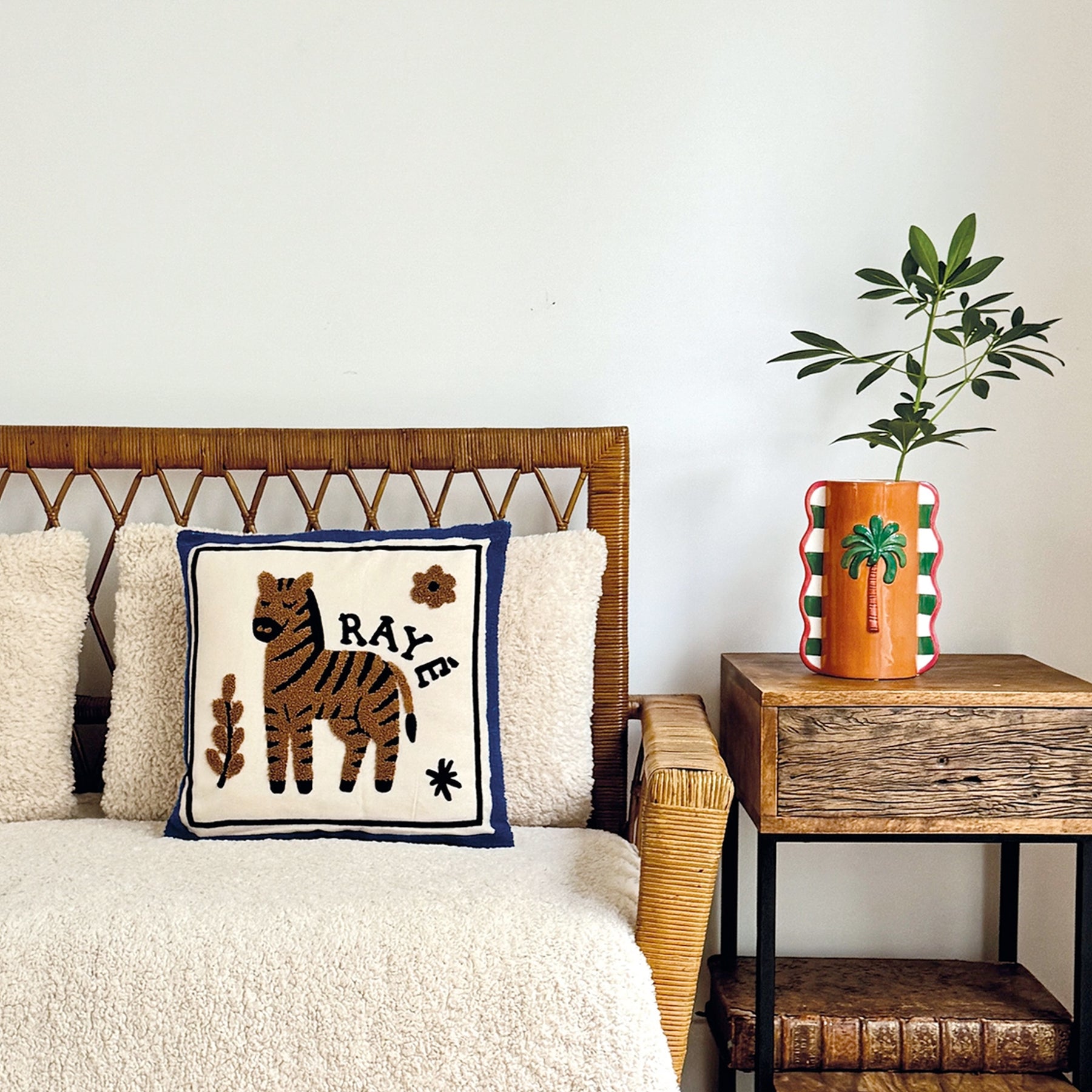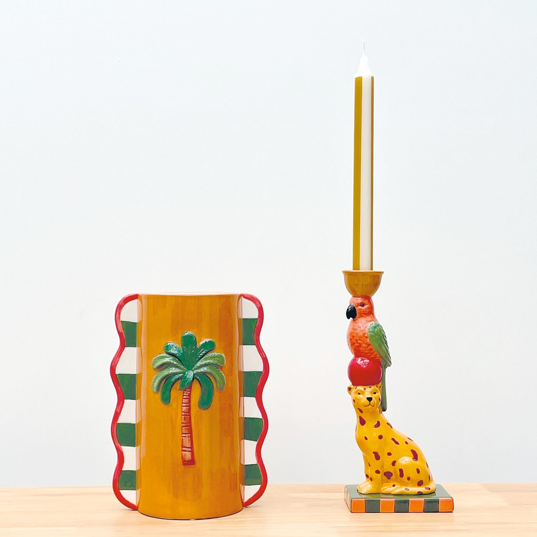 Zylindrische Keramikvase mit Palmen-Relief und Wellenrand