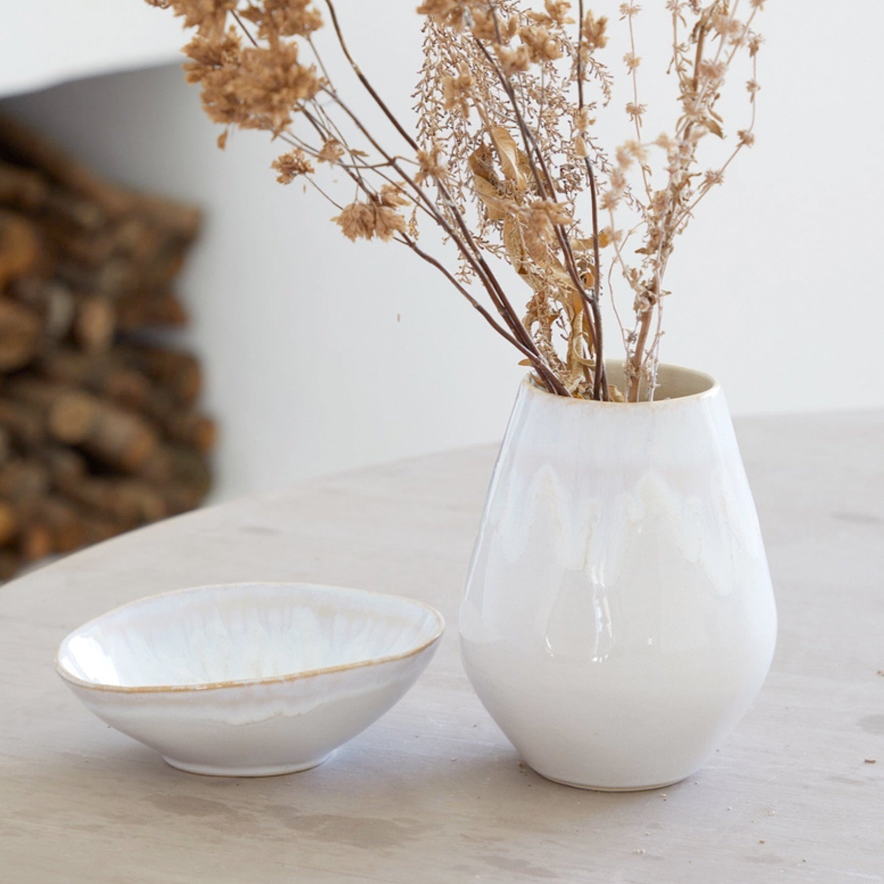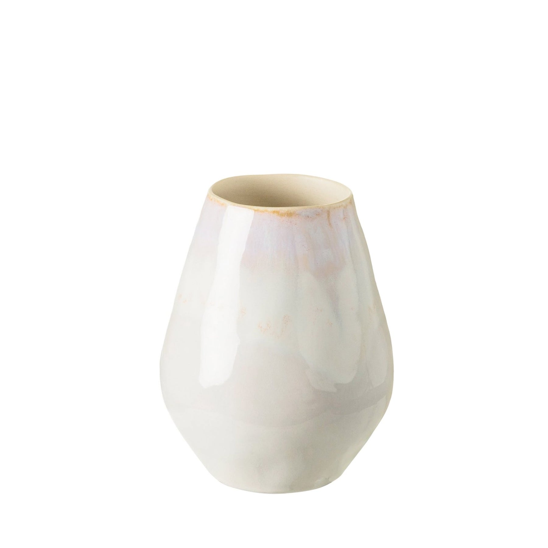 Handgefertigt aus feinem Steinzeug in Portugal. Die organische Form und die reaktive Glasur in Weiß- und Blautönen sind inspiriert von der Algarve-Küste. Die Glasur fließt sanft über die Oberfläche und macht jede Vase zu einem Unikat.