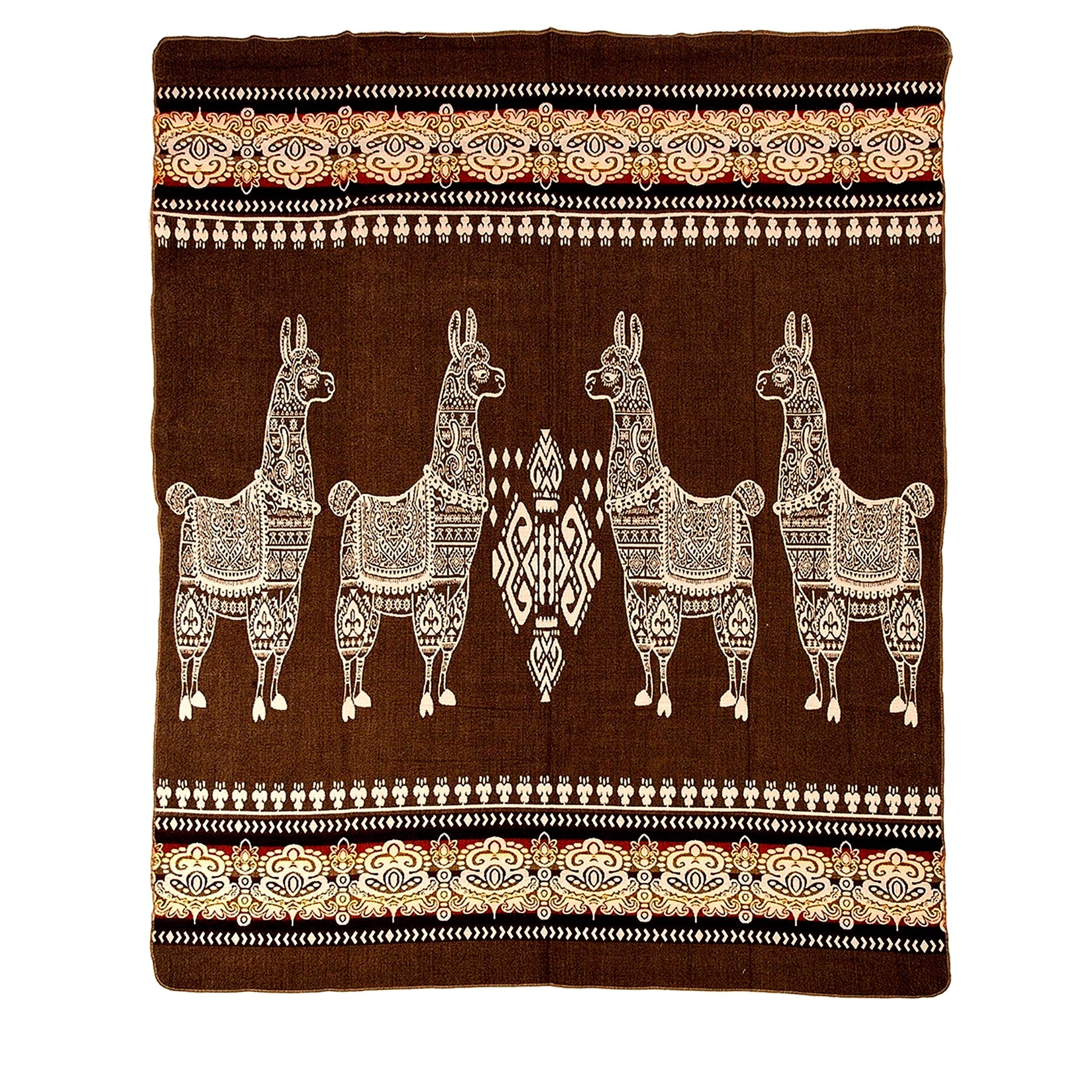 Alpaka-Decke mit einem dunkelbraunen Hintergrund. Im Zentrum sind vier stilisierte Lamas mit detaillierten Mustern in Weiß dargestellt, eingerahmt von dekorativen Bordüren am oberen und unteren Rand in Weiß, Beige und Rottönen
