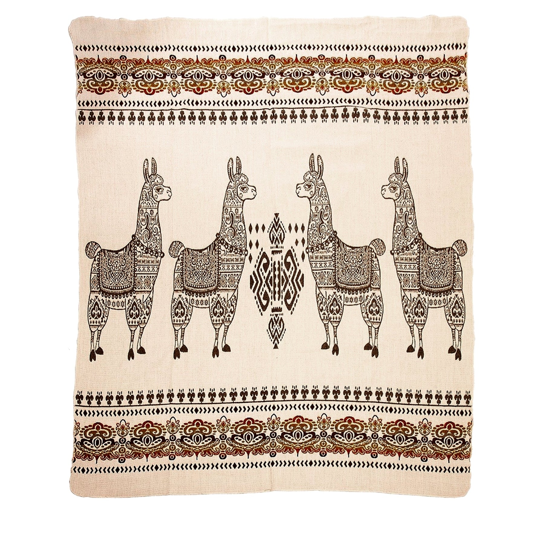 Alpaka-Decke mit einem hellbeigen Hintergrund. Im Zentrum sind vier stilisierte Lamas mit detaillierten Mustern in Braun dargestellt, eingerahmt von dekorativen Bordüren am oberen und unteren Rand in Braun, Beige und Rottönen