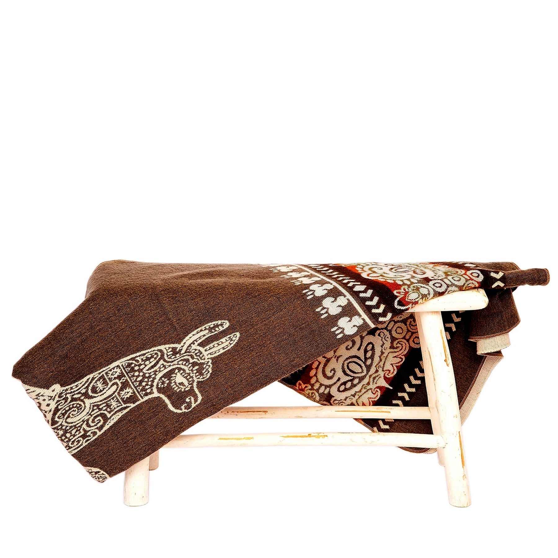 Eine dunkelbraune Alpaka-Decke mit einem weißen Lama-Kopfmotiv an einer Ecke liegt über einer kleinen, rustikalen weißen Holzbank. Die Decke ist teilweise umgeschlagen und zeigt auf der Rückseite ein helleres, florales Muster. Der Hintergrund ist weiß