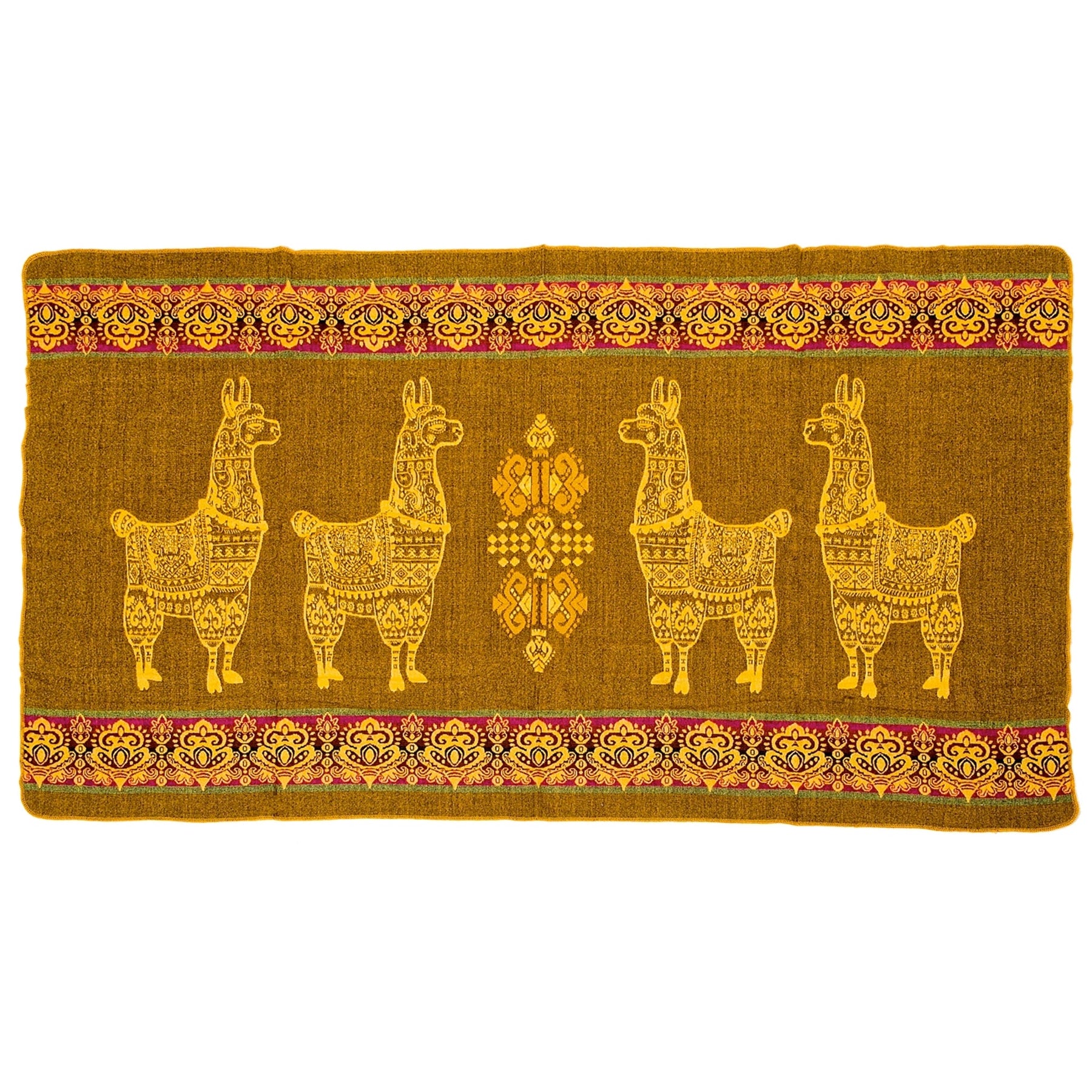 Alpaka-Decke mit einem braun-gelben, senffarbenen Hintergrund. Im Zentrum sind vier stilisierte Lamas mit detaillierten Mustern in Gelb dargestellt, eingerahmt von dekorativen Bordüren am oberen und unteren Rand in Fuchsia, Gelb und Grün