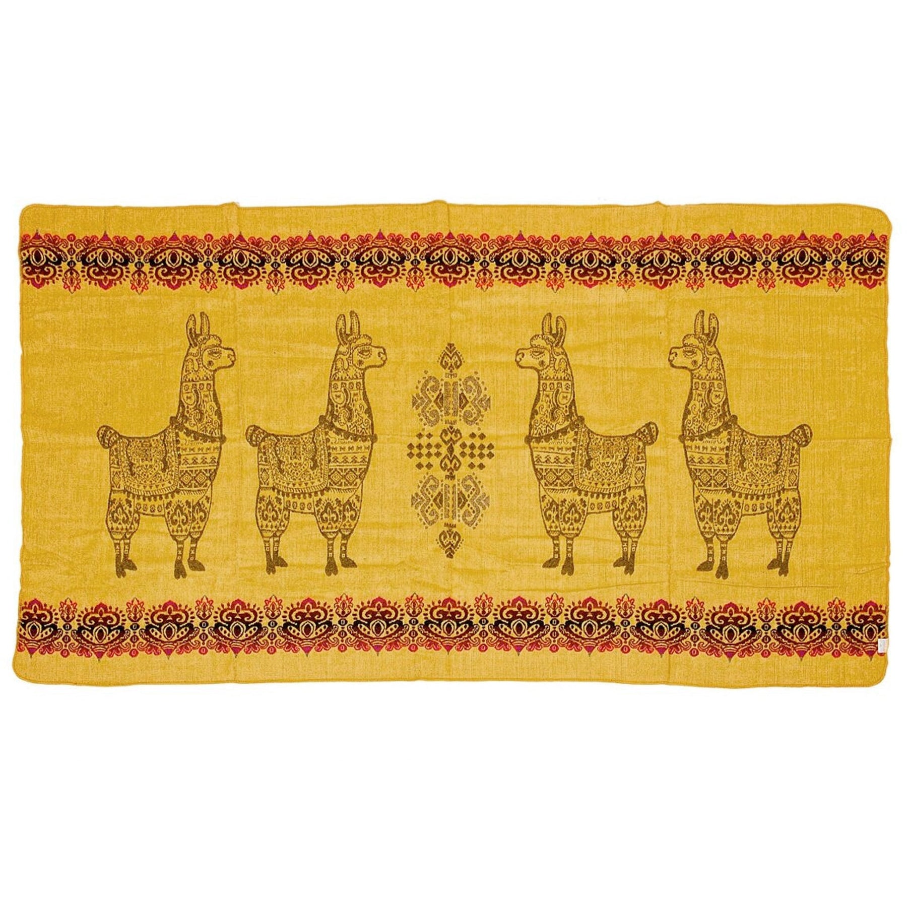 Alpaka-Decke mit einem leuchtend gelben Hintergrund. Im Zentrum sind vier stilisierte Lamas mit detaillierten Mustern in Dunkelbraun/Goldbraun dargestellt, eingerahmt von dekorativen Bordüren am oberen und unteren Rand in Rot, Beige und Dunkelbraun