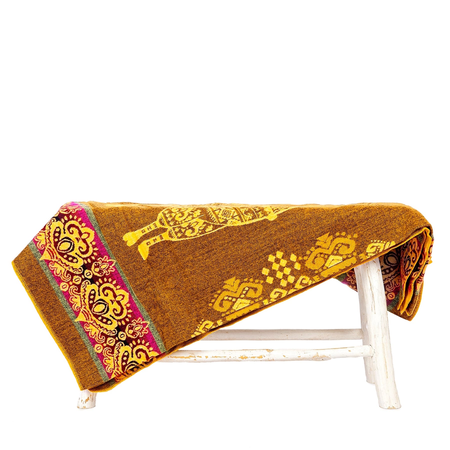 Eine senfgelbe Alpaka-Decke mit einem gelben Lama-Motiv und einer fuchsiafarbenen Bordüre liegt über einer kleinen, rustikalen weißen Holzbank. Die Decke ist teilweise umgeschlagen. Der Hintergrund ist weiß